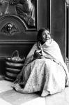 Indígena anciã pedindo esmola à porta de uma igreja.