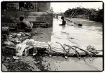 Varanasi, dead body got last bath in the Ganges, in the background young man washing the mud and human ashes, searching for gold crowns and jewellery.