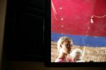 Uma jovem segura um bébé num bar na Fajã da Água.
