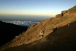 A descida do pico do vulcão do Fogo faz-se a correr por uma vertente muito íngreme e coberta de cinzas. Ao contrário da subida que pode ser penosa, a descida é uma diversão.