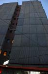 Lumière chaude aux fenètres sur facade froide d'immeuble